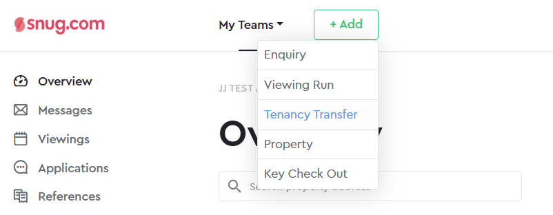 - Snug Overview page navigate to +Add button and select Tenancy Transfer