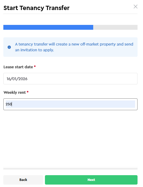 This feature introduces a comprehensive tenancy transfer tool that allows property managers to streamline the process of transferring existing tenants to new properties. This is also commonly referred to as a lease assignment, tenant transfer or change of shared tenancy.