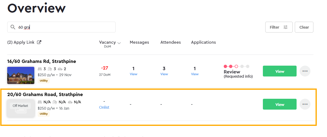 The property will now display as an Off Market where you can process any Viewings and Applications as per your normal Agency workflow