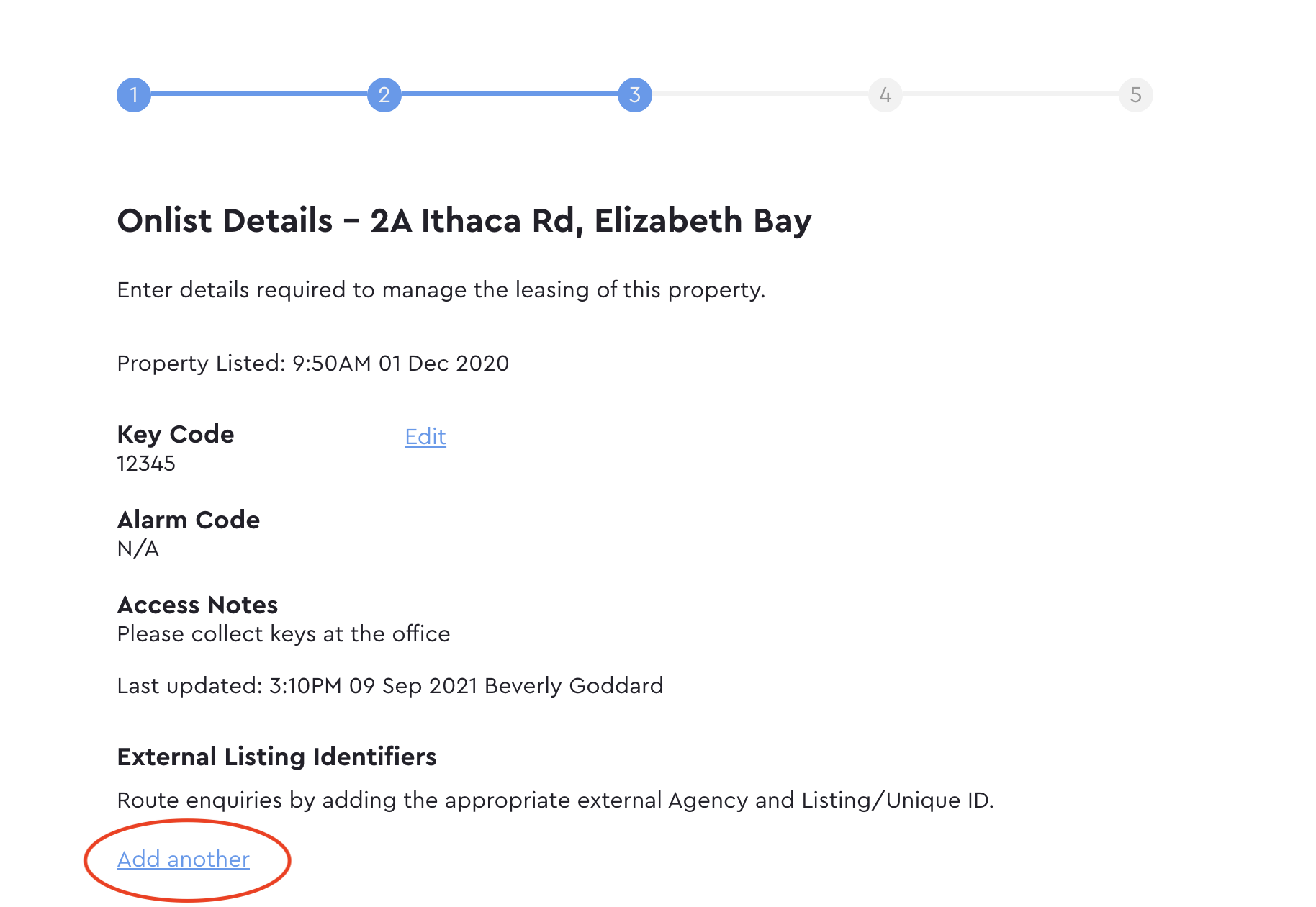 - Under External Listing Identifiers, add or edit the listing identifer. Select the source (e.g. Domain.com.au), Agency ID for the portal/uploader and the listing identifier